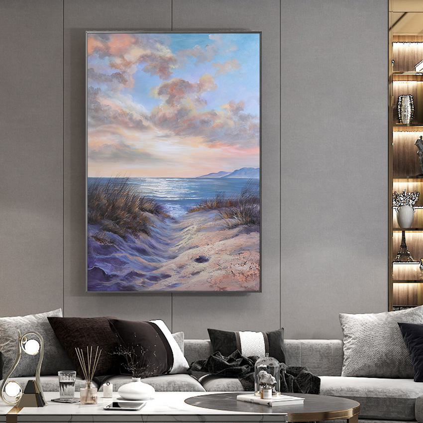 Pittura a olio su tela astratta moderna di paesaggio marino - Opera d'arte dipinta a mano progettata per la decorazione murale di case contemporanee e l'esposizione di arte paesaggistica.